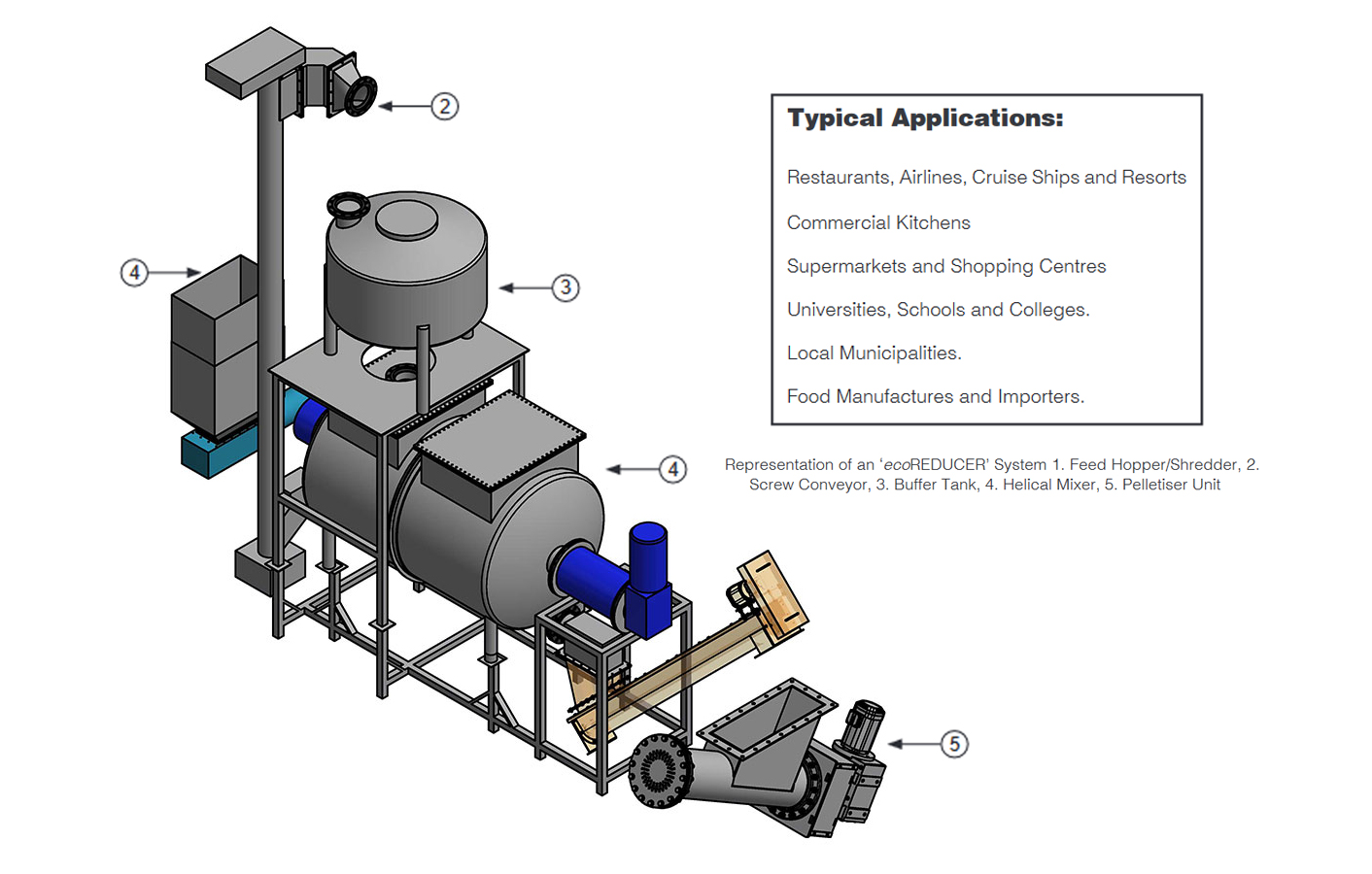 The ‘ecoREDUCER’ is a fully integrated waste management system that focuses upon the reduction of both the weight and volume of mixed waste. The waste is dried, compressed and pelletised before being discharged. Significantly, the system can be fed with any combination of waste, be it food waste, packaging, clinical waste or a mixture. Category 1 & 2 waste can also be processed and reduced in a safe and economical fashion.